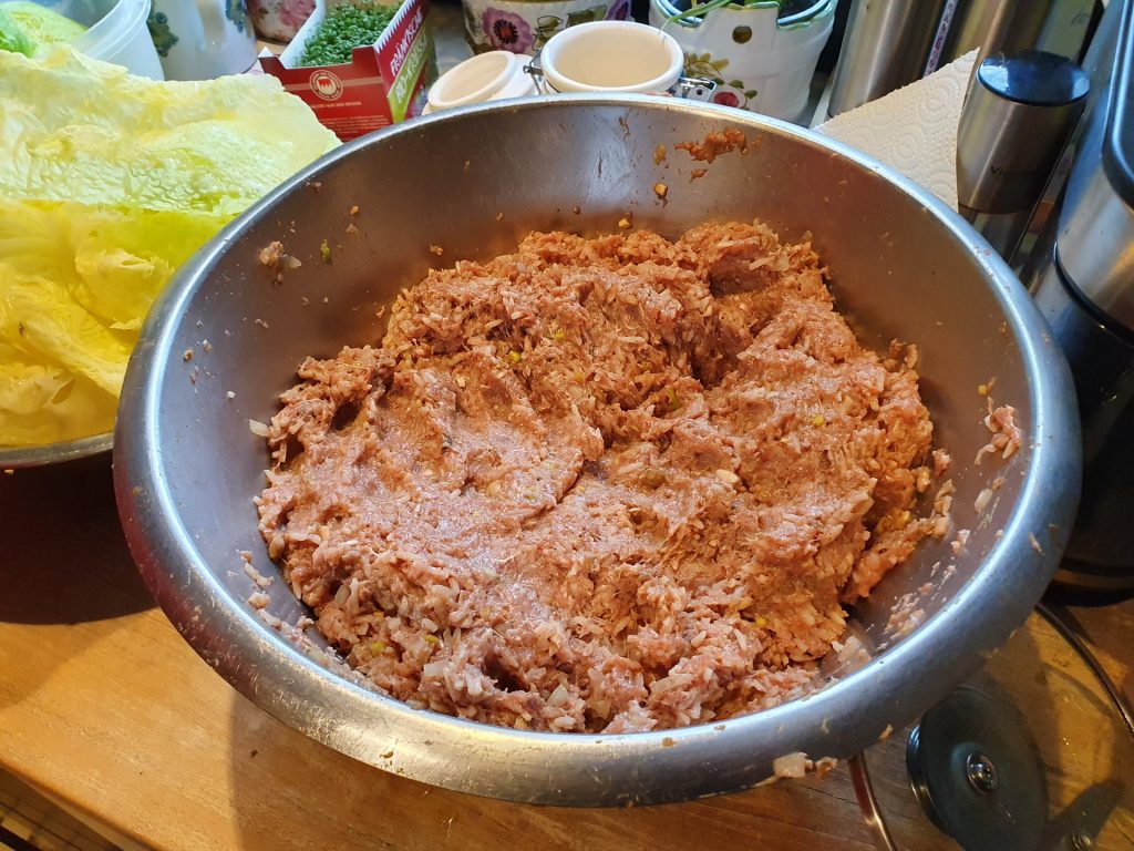 Do dużej miski dajemy mięso mielone, drobno pokrojoną, osoloną i wyciśniętą lekko (żeby pozbyć się goryczki) cebulę, prawie wszystkie pieczarki utarte na tarce, 400ml wywaru z kapusty, w którym rozpuszczam 1 kostkę rosołową. Przyprawiamy łyżką musztardy, papryką słodką i ostrą, przyprawą „Jarzynka”, albo „Vegeta”, maggi i dużo pieprzu – tu każdy może sobie sam doprawić do smaku. Dodajemy ryż i bardzo dokładnie mieszamy. Masa powinna być lekko wilgotna i klejąca, w żadnym wypadku nie sucha.
