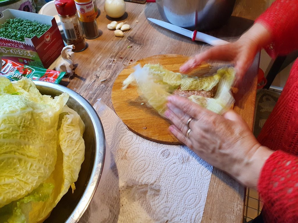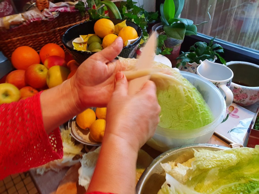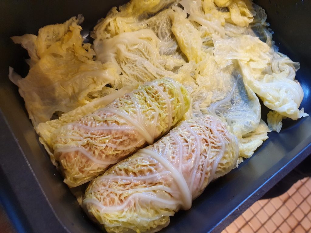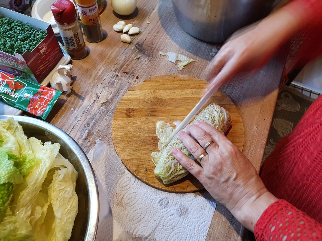 Do dużego garnka, takiego, żeby swobodnie zmieściła się cała kapusta, wkładamy ową kapustę, którą uprzednio nacinamy wokół głąba, tak, żeby łatwo było oddzielić liście – jeszcze lepiej jest wyciąć głąb w całości. Wlewamy wodę tak, żeby kapusta była cała zanurzona – najpierw głąbem do dołu. Zagotowujemy i gotujemy kilkanaście minut na małym ogniu, po czym odwracamy kapustę głąbem do góry. Teraz sukcesywnie, w miarę jak liście miękną i same „odchodzą” od główki, wyciągamy te liście na tacę i pozostawiamy do ostudzenia. Pozostałe małe liście i takie, które nie nadają się do zawijania, wykorzystamy do wyłożenia garnka.