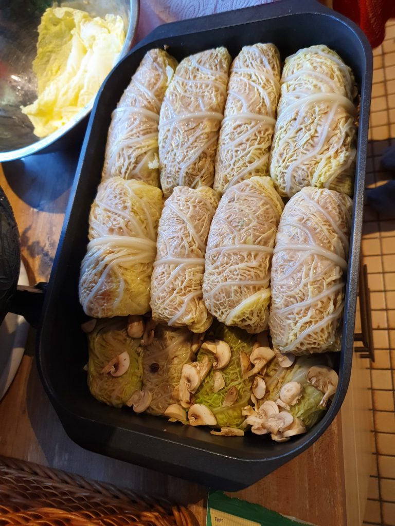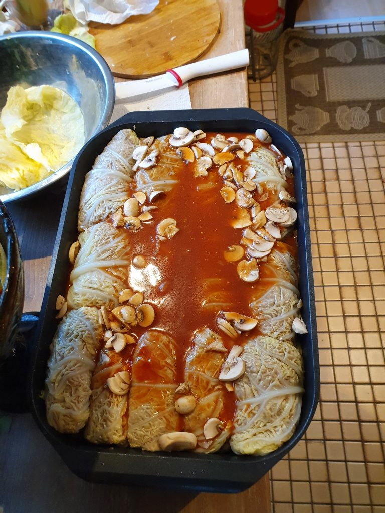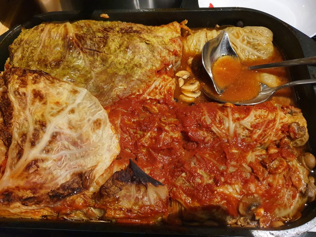 Przykryty garnek wstawiamy do nagrzanego do 180 – 200°C piekarnika (nasz garnek może być używany do maksymalnie 180 stopni) i zapiekamy – Małżonka uważa, że dusimy – przez co najmniej półtorej godziny. Czas zależy od temperatury i ilości warstw, których nie powinno być więcej, niż dwie, maksymalnie trzy przy mniejszych gołąbkach.