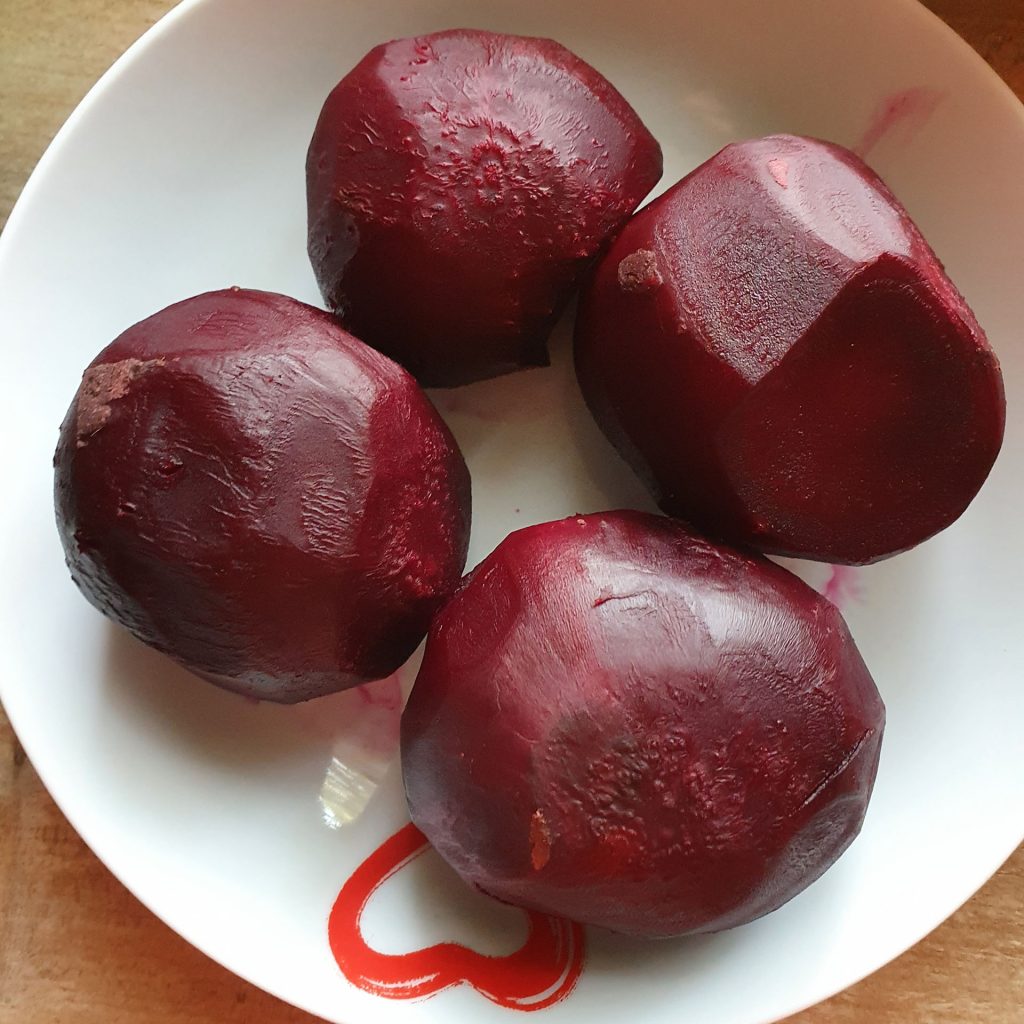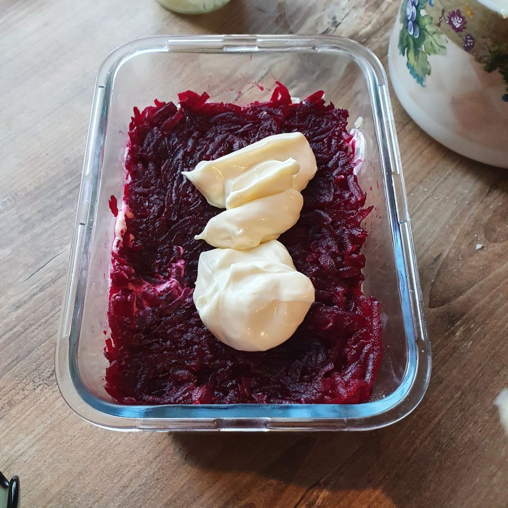 Nakładamy jedną trzecią majonezu, solimy, pieprzymy. Następnie układamy warstwę utartych na grubej tarce buraczków: