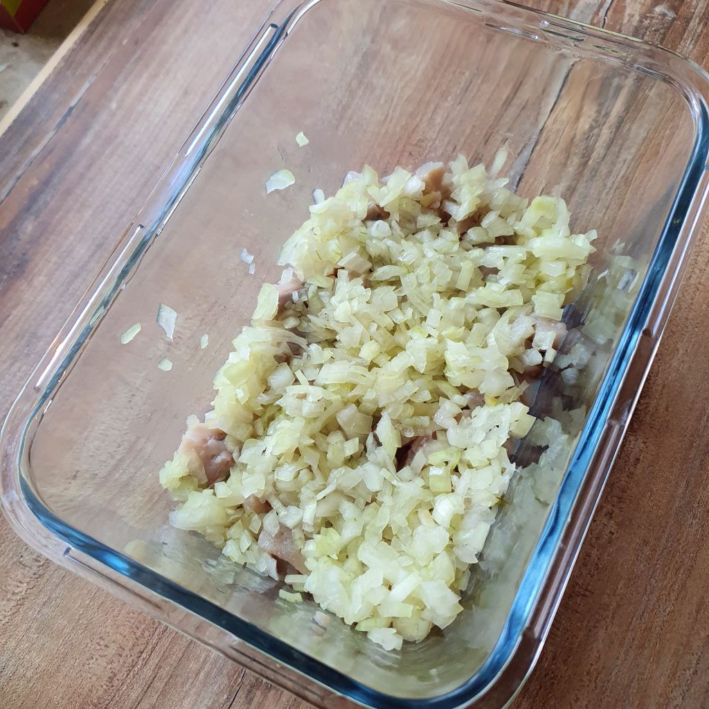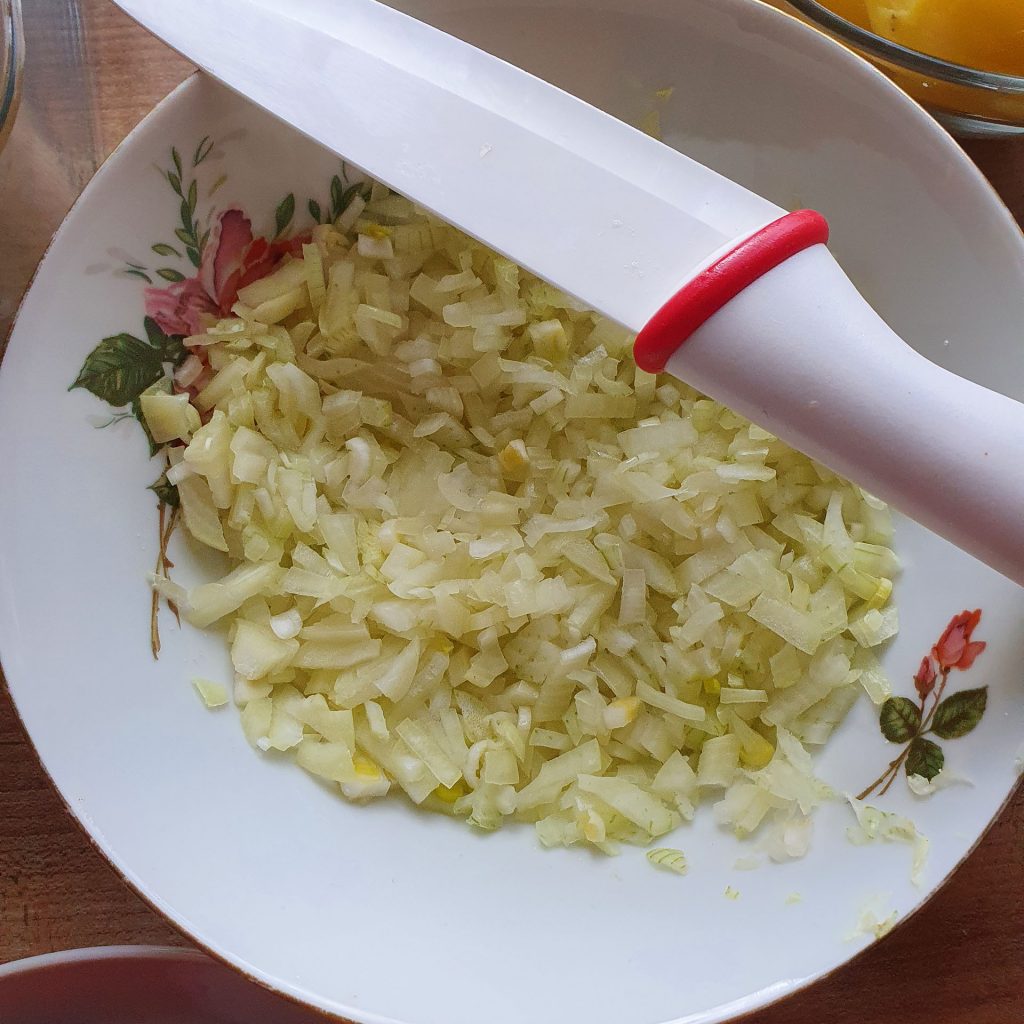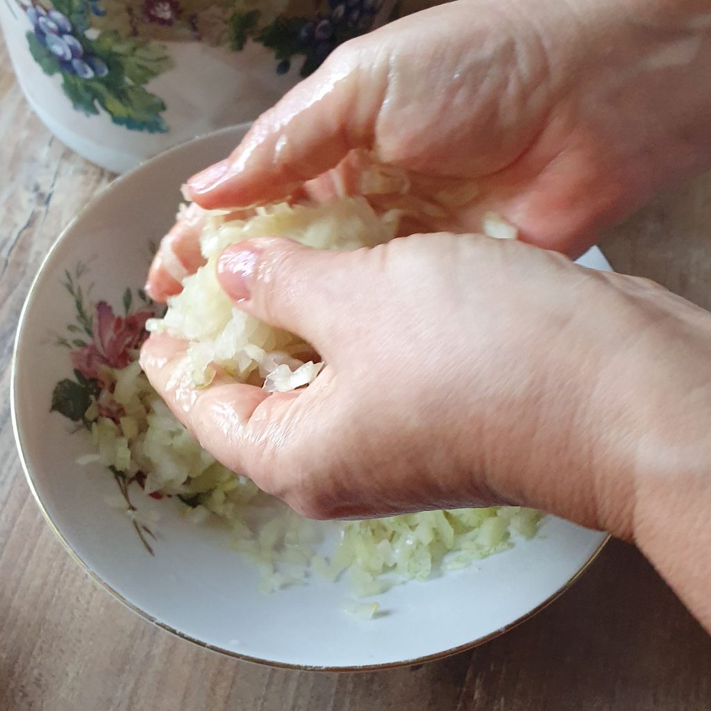 Cebulę kroimy w drobną kosteczkę, solimy i mieszamy, żeby pozbyć się „goryczki”: