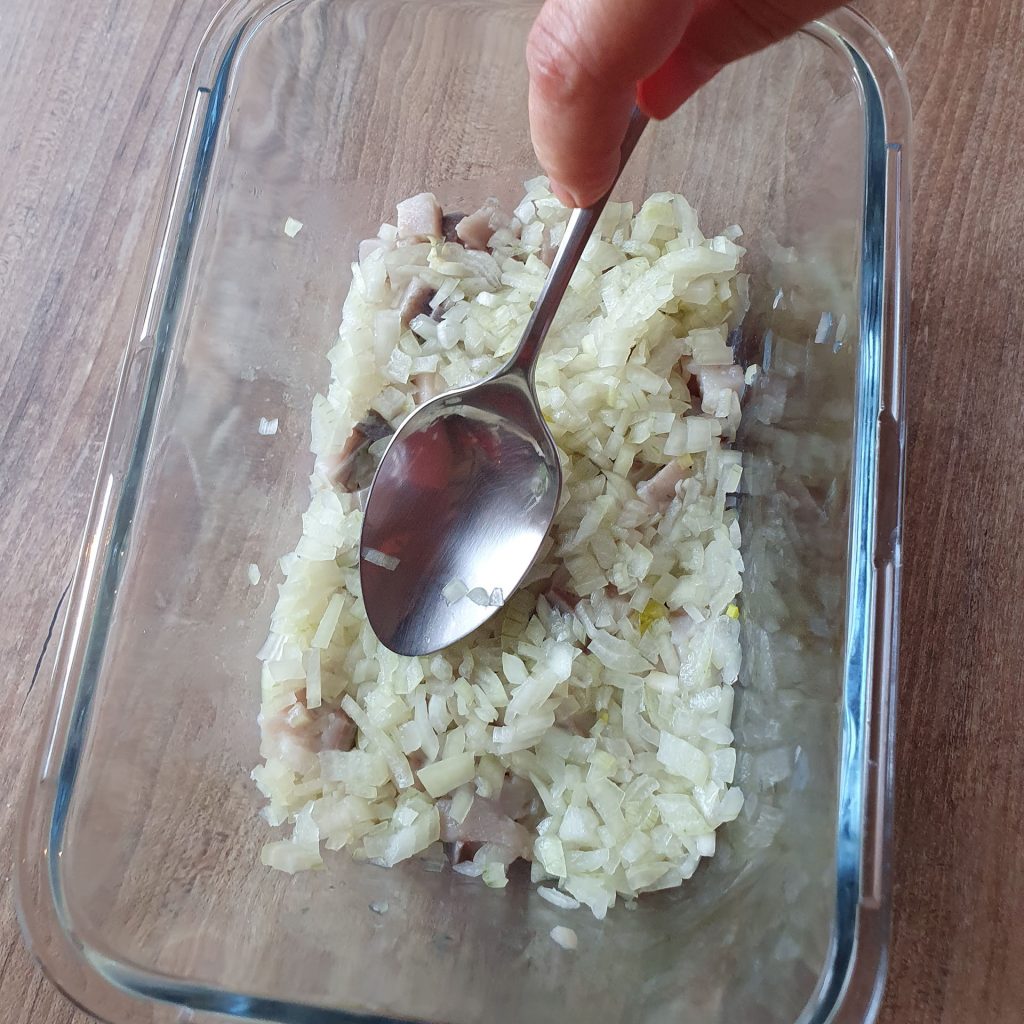 Na warstwę śledzia układamy warstwę cebuli, wyciskając ją lekko z goryczkowatego soku: