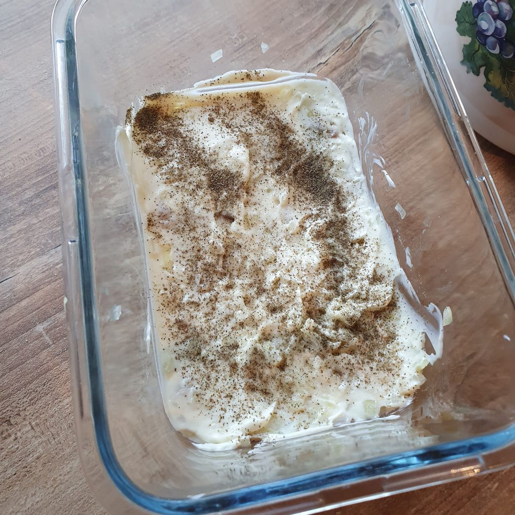 Na warstwę cebuli dajemy jedną trzecią majonezu, wygładzamy i posypujemy solą i pieprzem według upodobania – my lubimy dużo pieprzu: