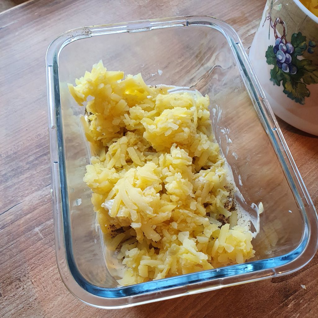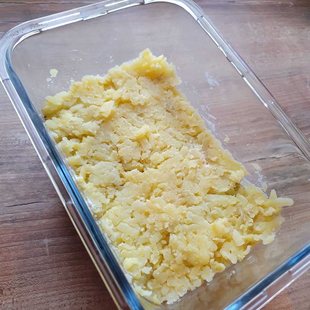 Następnie układamy warstwę utartych na grubej tarce ziemniaków: