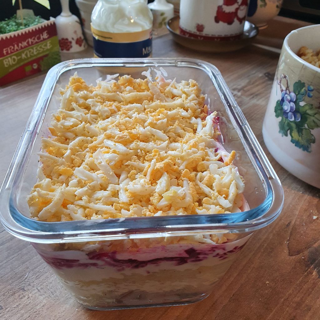 Na Wielki Piątek przygotowałam moją – jedną z wielu – specjalność: sałatkę śledziową z „pierzynką”. Przepis jest bardzo prosty, a wynik smakowity i dla podniebienia, i dla oka.