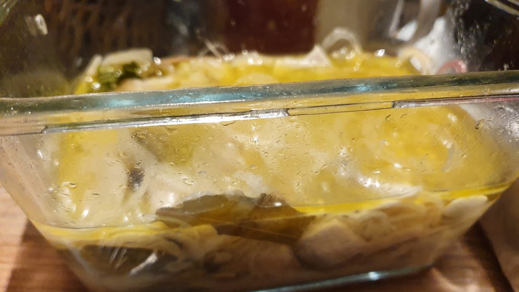 Za dawnych czasów kupowałam śledzie z beczki, które moczyłam w przez kilka godzin w wodzie, od kilku lat kupuję matjes w zalewie olejowej (w Polsce od Lisnera, tutaj produkt firmy Nadler lub Homann), kroję w duże kawałki i układam warstwami, na przemian z pokrojoną w krążki cebulą. Dodaję kilka ząbków czosnku i trochę naturalnej oliwy z oliwek (nie osączam matjes z oleju). Na koniec dodaję wystudzoną zalewę z octu, wody i przypraw: ziarenek ziela angielskiego, pieprzu i listków laurowych. Na 800g śledzi biorę cztery średnie cebule. Zalewa octowa to 500ml wody i 100 ml octu, które zagotowuję z przyprawami. Oliwa wypływa na wierzch i na drugi dzień można już się delektować śledzikiem.