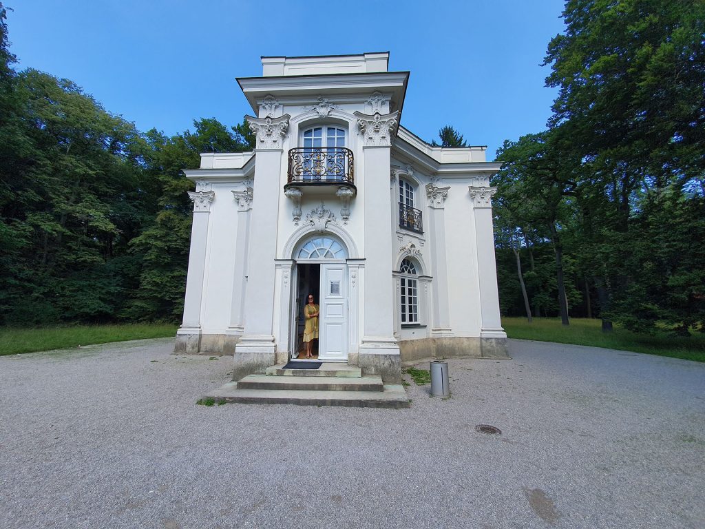 Po zwiedzaniu komnat przyszedł czas na wielki, pięknie położony i zaprojektowany park przypałacowy. Mimo pięknej pogody i gotowości do dłuższych spacerów, dotarliśmy tylko do pałacyku Pagodenburg (nazwanym tak ze względu na malowidła w chińkim stylu we wnętrzu), gdzie odpoczęliśmy i zdecydowaliśmy się na powrót. Niestety nie dotarliśmy do pałacyków-pawilonów Badenburg, Amalienburg i Magdalenenklause (samotnia Magdaleny). Pominęliśmy również muzeum powozów i sań oraz muzeum porcelany. Okazuje się, że aby przejść sam park i odwiedzić cztery pawilony, potrzeba na to około dwóch godzin.