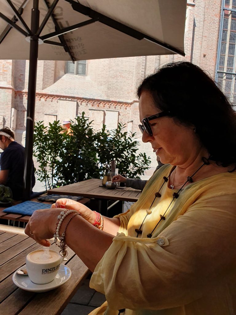 Teraz już tylko marzyliśmy o kawie w jakiejś przytulnej kafejce na starym mieście. Po dotarciu do parkingu – co w Monachium nie jest takie łatwe – wybraliśmy się pieszo na monachijską starówkę. Znaleźliśmy miejsca w ogródku kawiarni przy samej katedrze, gdzie w cudownej atmosferze zabytkowych murów wypiliśmy pyszną, świeżo paloną kawkę.