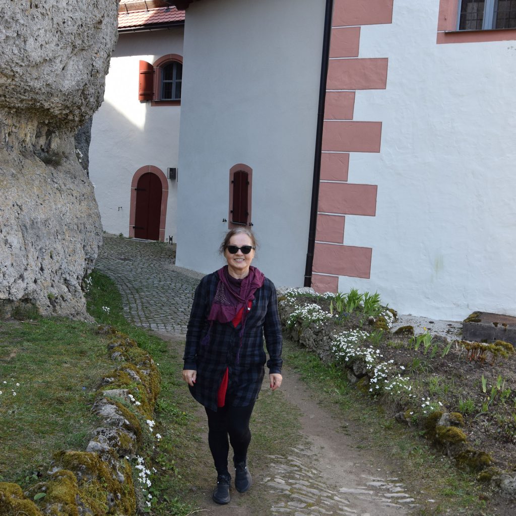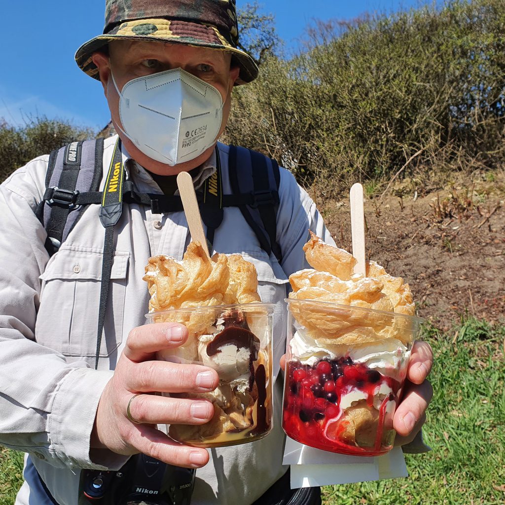 U podnóża zamku czekała na nas dodatkowa i niespodziewana (z uwagi na pandemię) atrakcja: mieliśmy okazję spróbować słynnych ptysiów, najlepszych w całej Bawarii, serwowanych w kawiarni Windbeutel-Cafe. Rzeczywiście, tak pysznych ptysiów nie jadłam jeszcze. Ja dostałam z leśnymi owocami i owocową polewą, z lodami w środku, a wszystko to przykryte bitą śmietaną i kruchutkim, puszystym jak mgiełka ptysiem. Mąż miał ptysia z karmelem, polewą czekoladową i orzechami zamiast owoców. Zazwyczaj podaje się tam owe ptysie na talerzach, jednak ze względu na pandemię kupujący podchodzili do okienka kawiarni, w maseczkach i utrzymując dystans, a słodkości otrzymywali w dużych jednorazowych, przeźroczystych (żeby choć trochę było widać wszystkie składniki) kubkach. Piękna, słoneczna pogoda sprawiła, że był duży ruch, większość gości przyjechała samochodami, byli też rowerzyści i piesi turyści – jak my. Zamiast przy stoliku usiedliśmy na pochyłej łące przyległej do kawiarni, gdzie delektowaliśmy się deserem i widokiem na zamek.