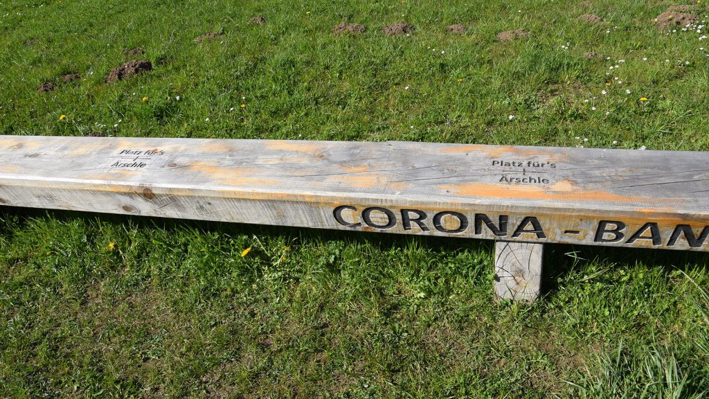 W drodze na parking przysiedliśmy na długiej „koronowej” ławeczce (niem. Corona – Bank), na której krzyżykami były zaznaczone odstępy z dowcipnym dopiskiem „miejsce na pupcię”. Mile zaskoczyła mnie pomysłowość ludzi i ich poczucie humoru. Widać i w pandemii można wykazać się interesującą koncepcją, ideą, trzeba zwyczajnie tylko chcieć i próbować nowego.